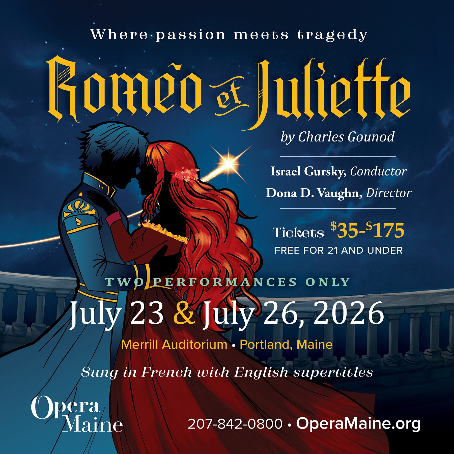 Experience the timeless passion of Shakespeare’s most popular love story through the beautiful music of Charles Gounod’s Roméo et Juliette. With soaring melodies and heart-stopping drama, Opera Maine’s 2026 production of this renowned classic will celebrate the power of young love-and the price of destiny.